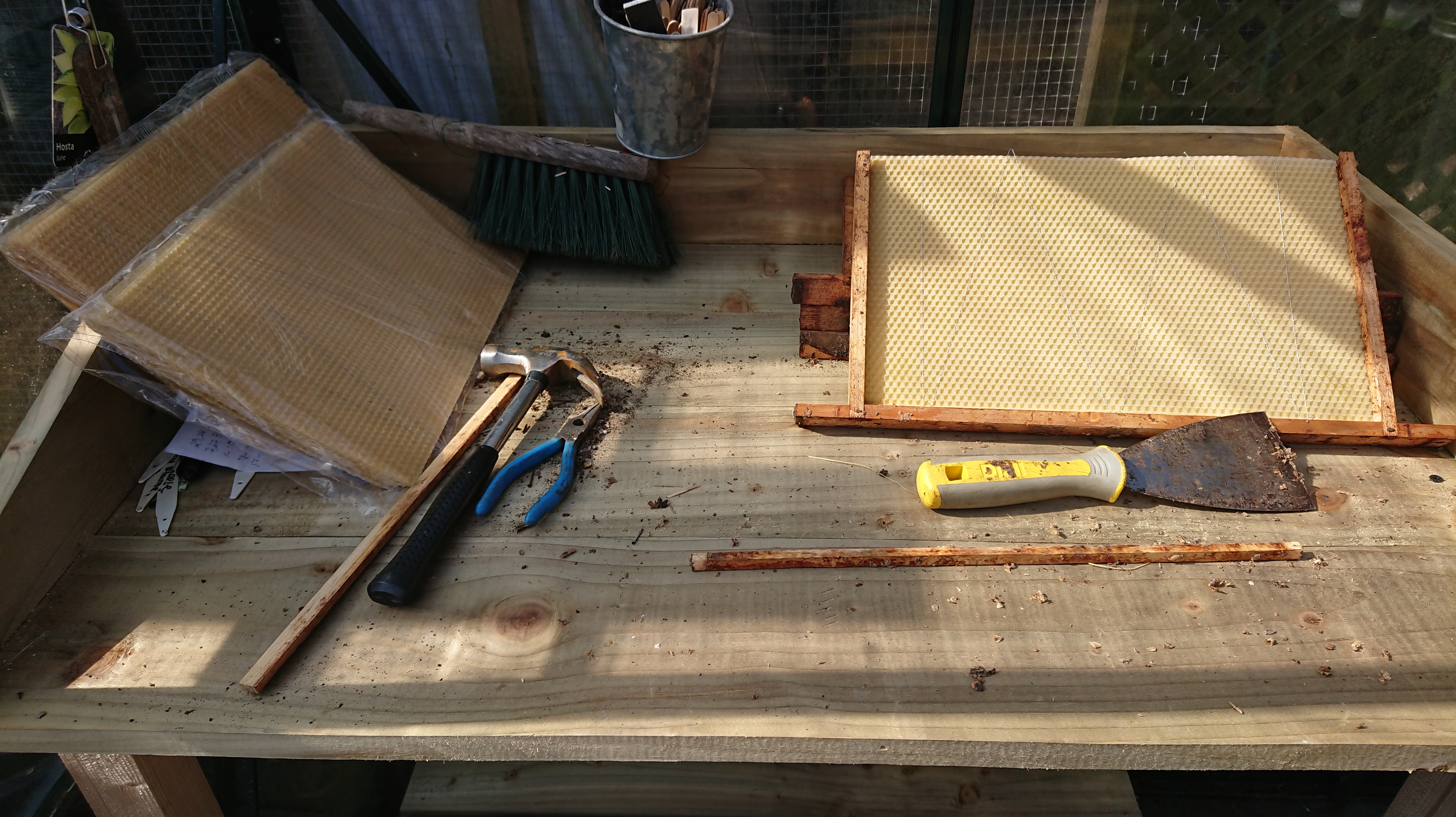 I really enjoy this job, it’s meditative, reasonably quick work and it makes my hands smell of bees wax and propolis. I’ve included a picture of our hens as my workbench is right next-door to their run, they like to say hello when we’re all outside. After the frames are re-built we give them to the bees to use as they see fit – they are such a clever bunch.