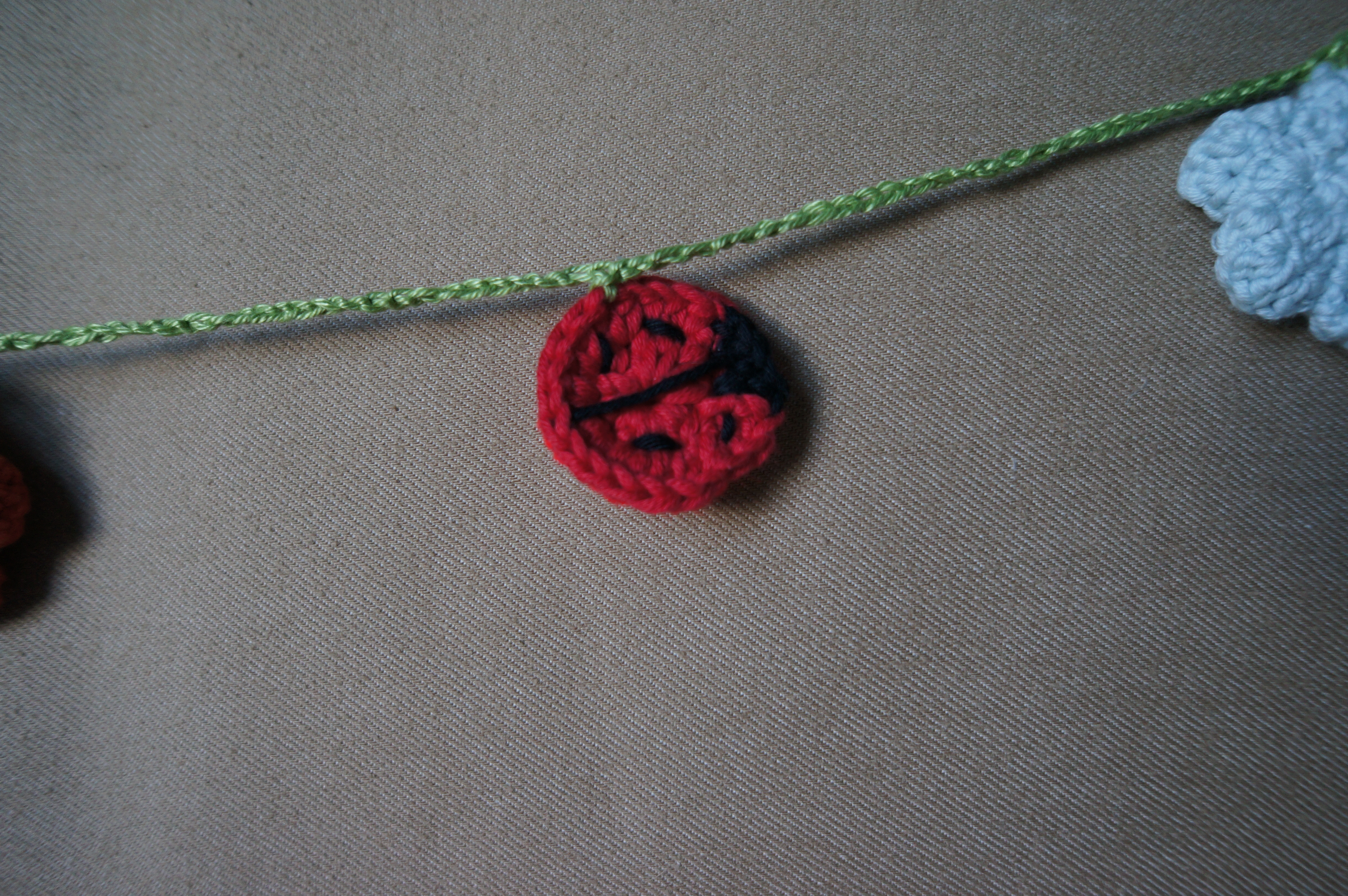 The lady birds were made using Attic24’s flat circle tutorial, I left a gap in the second round and changed colour from red to black to make the head.  There are lots of flower patterns knocking around on-line, but I used this one from  Sarahndipities lovely flower garland tutorial.