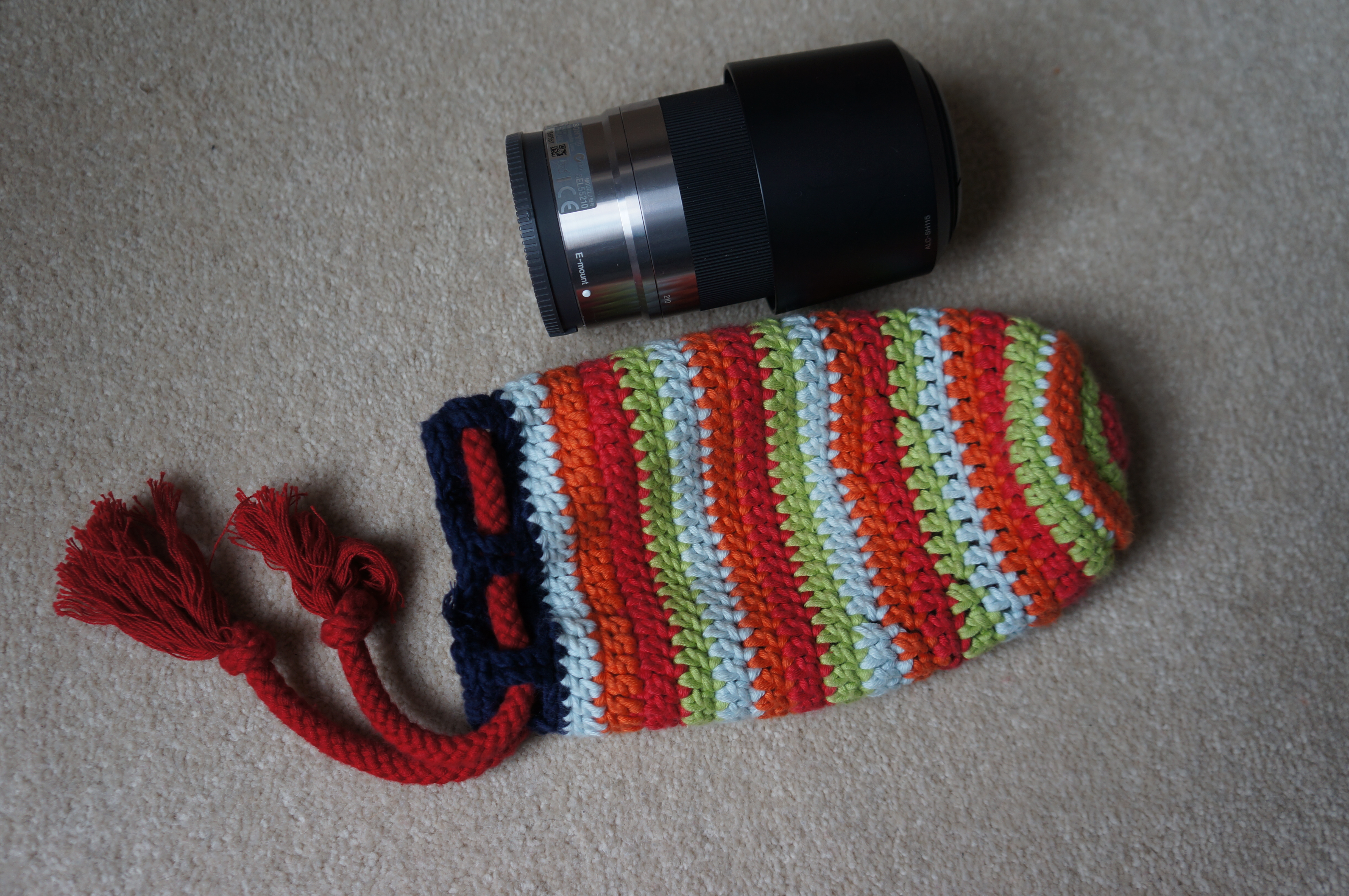 keyringMr Ginger likes his pictures and he got himself a super zoom lens from eBay – it obviously needed a super case to keep it safe and sound.  I made the pattern up as I went along, but the basics came from Attic24’s fabby baggy blog post which is here.